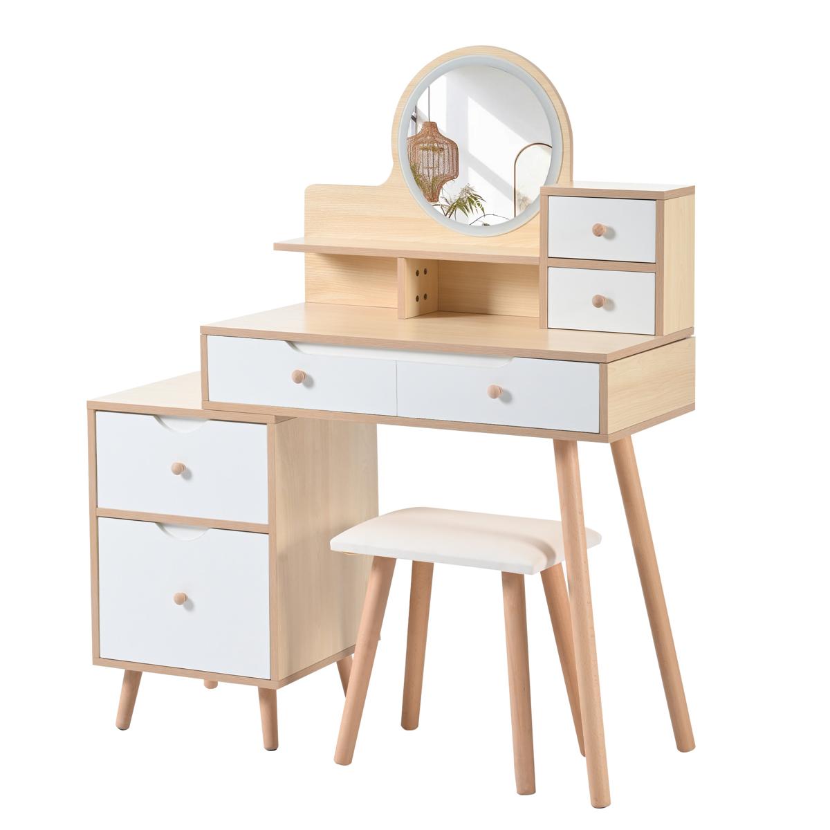 ドレッサー化粧台 テーブル 鏡台 LEDライト付き スツール付き 引き出し 収納 サイド収納 メイク台 シンプル 大容量 可愛い Natural Solid Wood