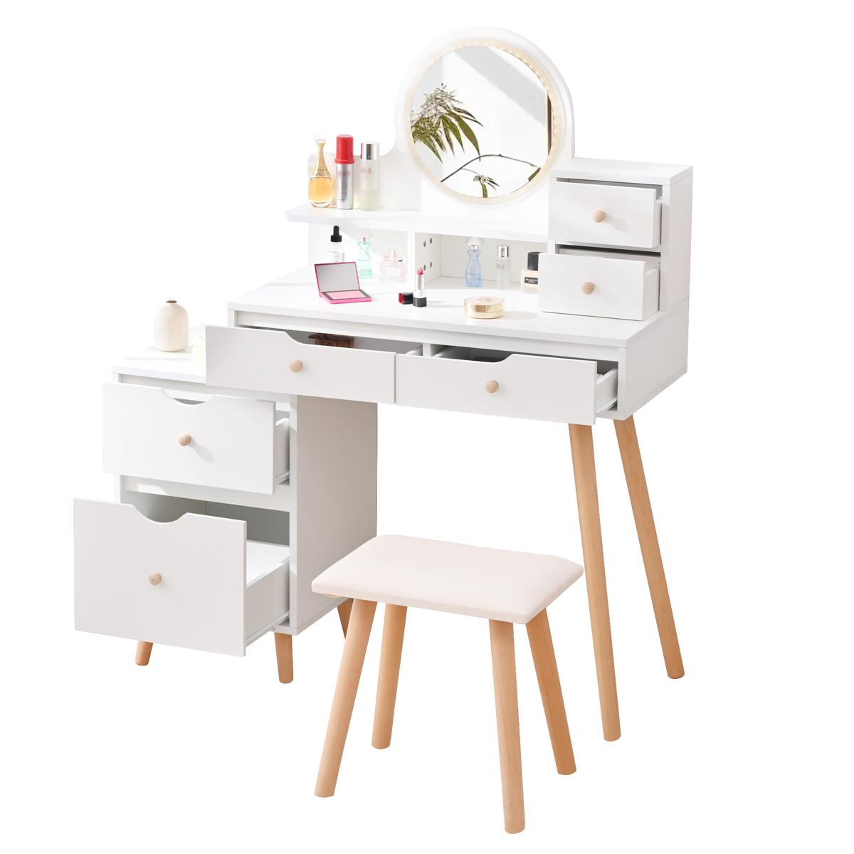 ドレッサー化粧台 テーブル 鏡台 LEDライト付き スツール付き 引き出し 収納 サイド収納 メイク台 シンプル 大容量 可愛い White Solid Wood