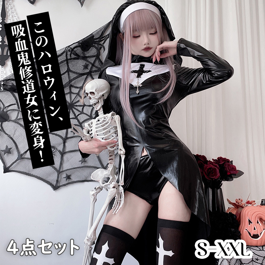ハロウィン 吸血鬼 仮装 cosplay レディース 4点セット 修道女服 十字架 ダーク ゴシック風 コスプレ衣装 女性用コスプレ イベント ステージ 文化祭 お祭り コスチューム 変身 変装 実物撮影 学園祭 コスプレ 可愛い セクシー
