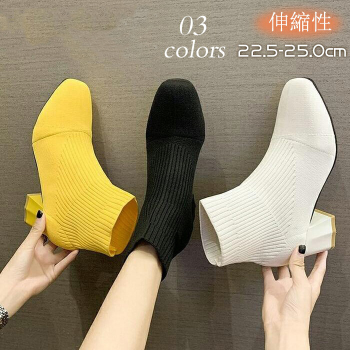 3色 ソックスブーツ ショートブーツレディース 大きいサイズスクエアトゥ秋冬靴 ミドルヒール 太ヒールチャンキーヒール伸縮性ストレッチ素材フィット靴下ブーツエナメルブラックソックスブーツ