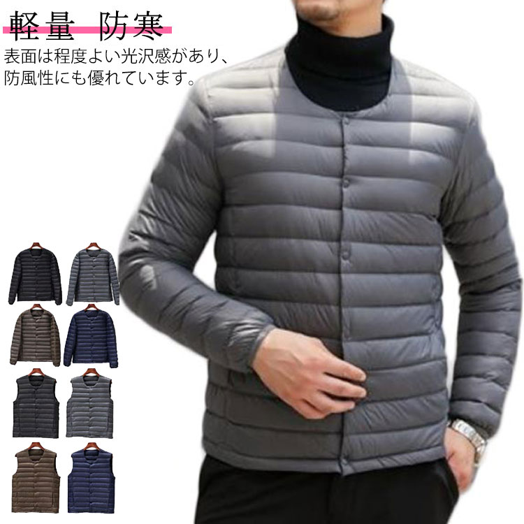 ライトダウン ダウンジャケット メンズ ラウンドネック ダウン インナーダウン ショート ダウンベスト 軽量 防寒 インナー アウター あったか 暖かい ノーカラー ベスト